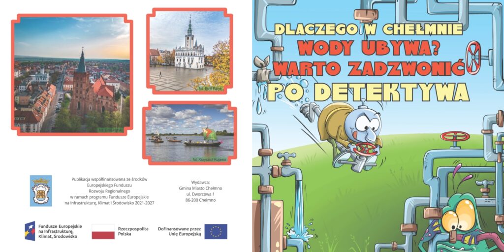 Zachęcamy Państwa do zapoznania się z publikacją pt. „Dlaczego w Chełmnie wody ubywa? Warto zadzwonić po detektywa”. To barwna i angażująca opowieść w formie komiksu, która w przystępny sposób przybliża najmłodszym niezwykle ważny temat ochrony zasobów wodnych.